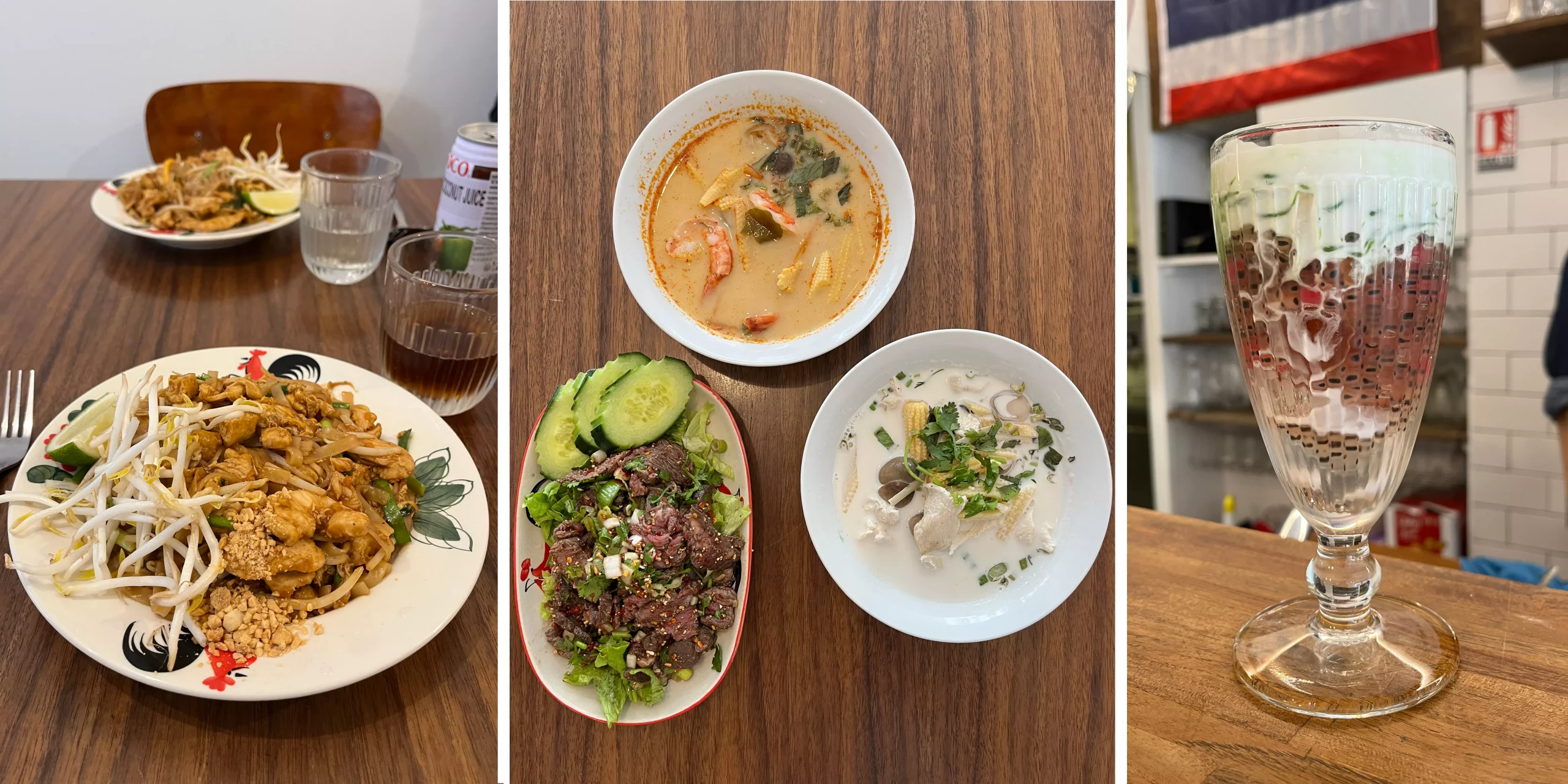 Ainsi, à la carte, on retrouve les célèbres pad thai, pad kraprao et pad see ew, au poulet, bœuf, tofu ou encore crevettes. Ces plats sont un mélange de nouilles de riz sautées au wok, avec des petits légumes, de la sauce sucrée ou épicée et une viande au choix. Par ailleurs, avec une base de riz, on retrouve aussi les khao pad aux légumes, poulet et crevettes. Ils cuisinent aussi du curry vert, des nems et une sélection de soupes et de salades. Concernant les desserts, en ce moment, Zaap Thai en propose deux : du riz gluant à la mangue et au lait de coco, et le trois couleurs, un dessert liquide surprenant.